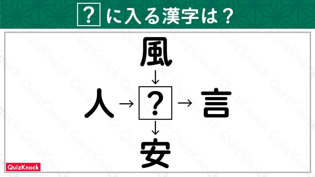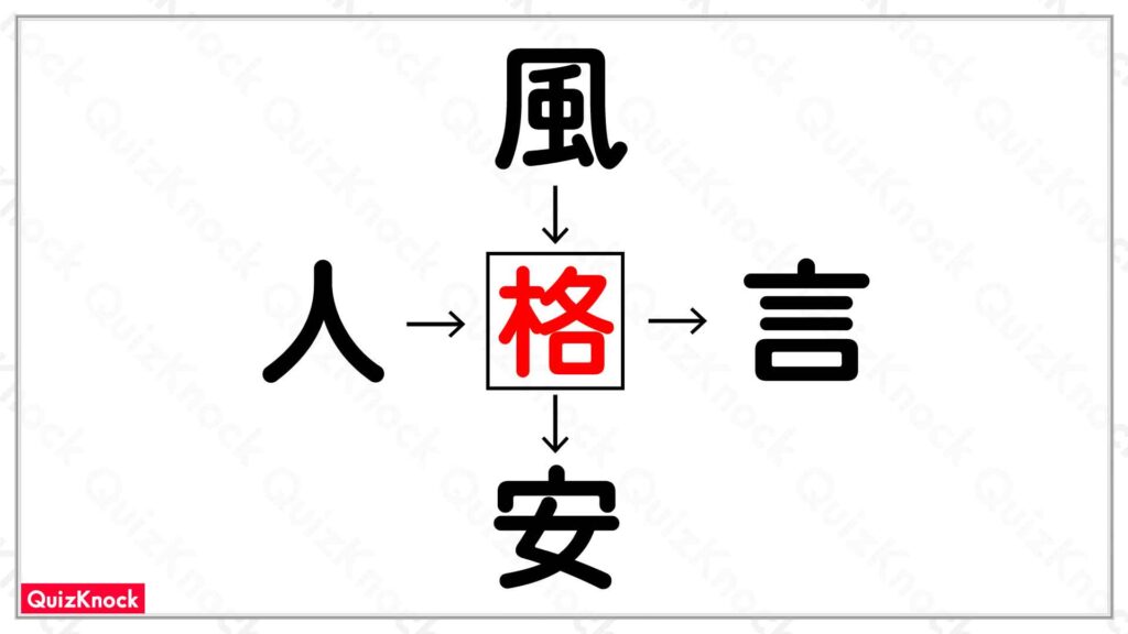 答えは「格」です。「風格」「人格」「格言」「格安」の4つの熟語ができます。