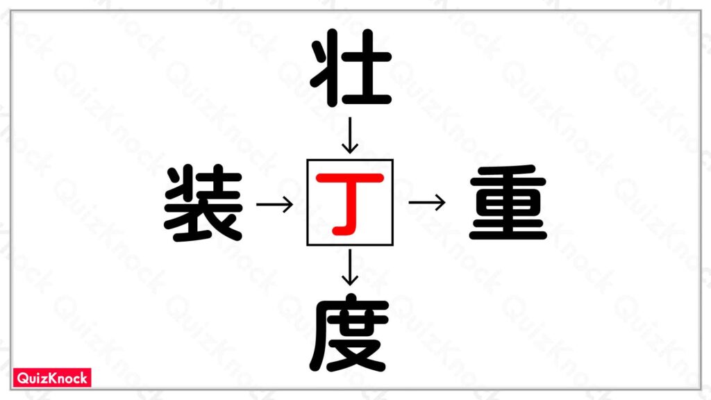 答えは「丁」です。「壮丁」「装丁」「丁重」「丁度」の4つの熟語ができます。