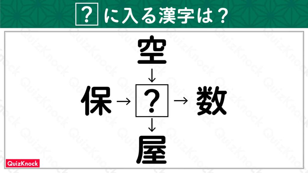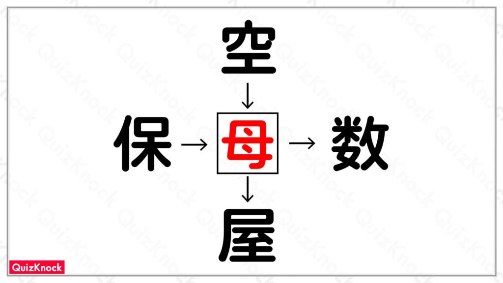 答えは「母」です。「空母」「保母」「母数」「母屋」の4つの熟語ができます。