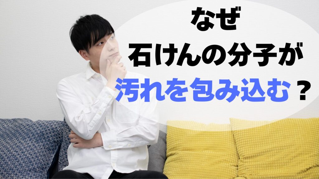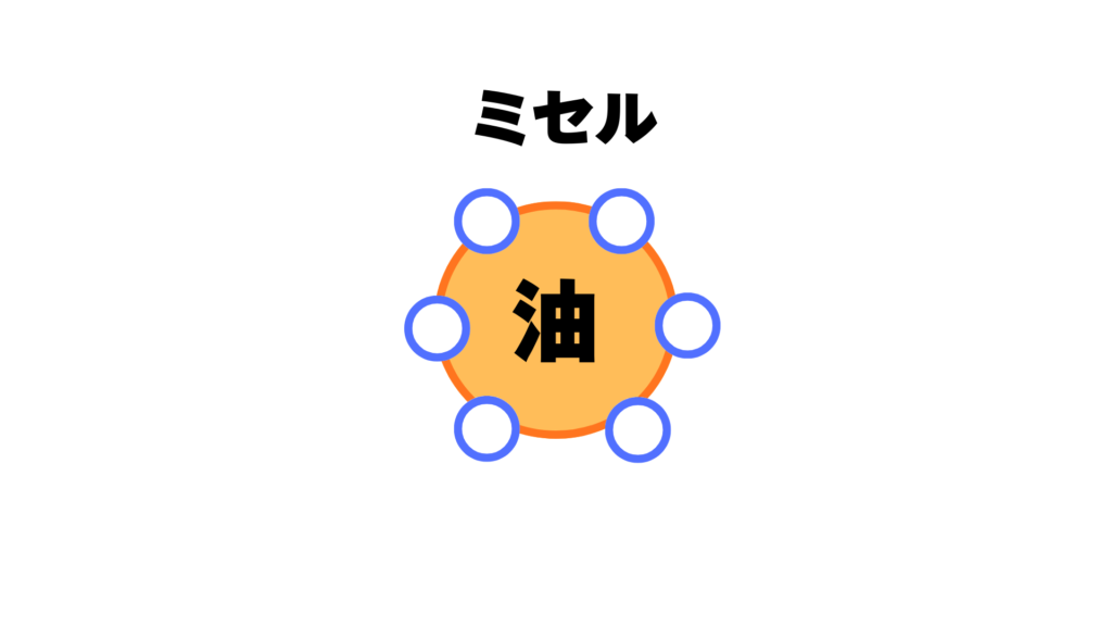 石けんを水に入れると、石けんの分子が油のまわりに集まり、油汚れの周りを取り囲みます。このとき、油はそのまま水に溶けるのではなく、石けんに包まれた小さなかたまりとして水の中に分散します。このかたまりを「ミセル」と呼びます。