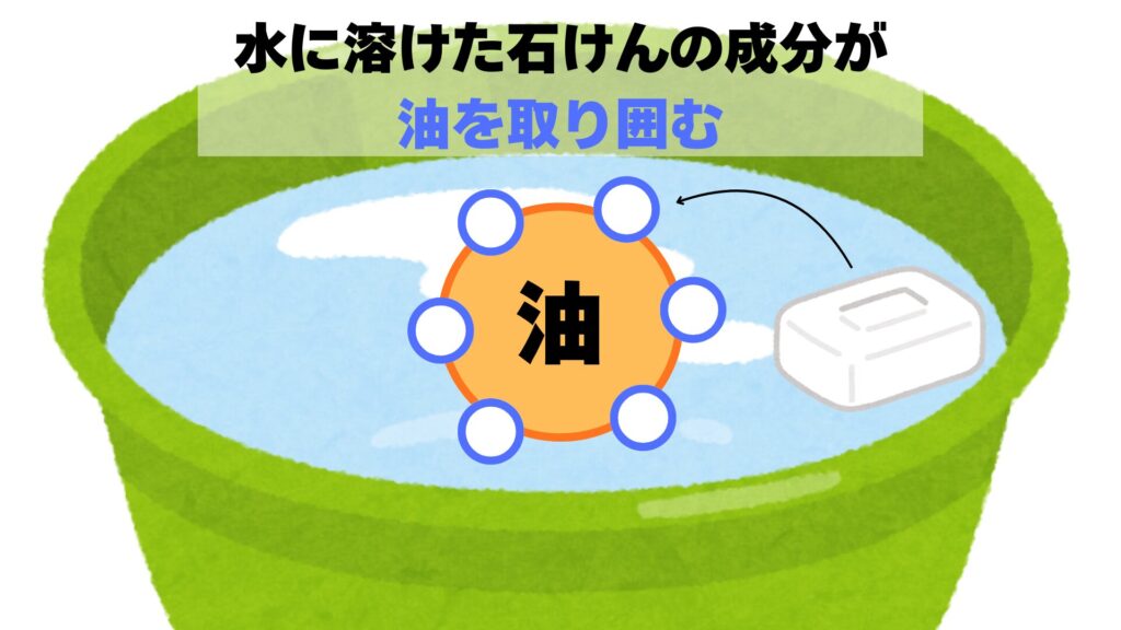 その結果、もともとは水とはじき合っていた油が、水の中に広がった状態になり、水の流れに乗って簡単に落ちるようになります。