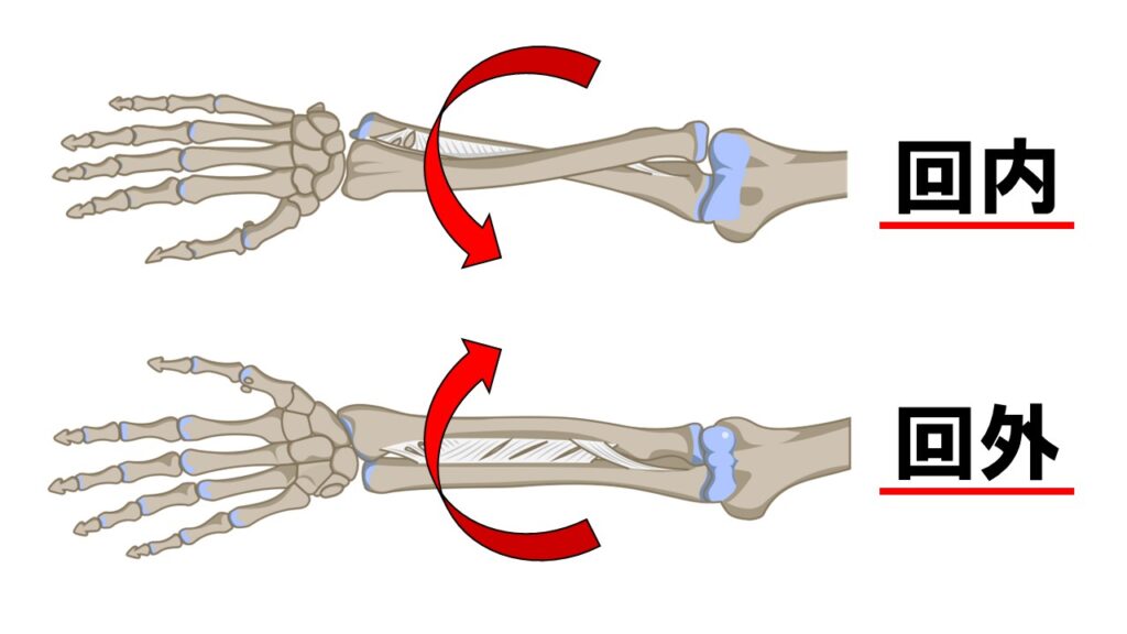 先ほどの初期位置から、手のひらを下に向ける動きを回内、手のひらを上に向ける動きを回外といいます。
