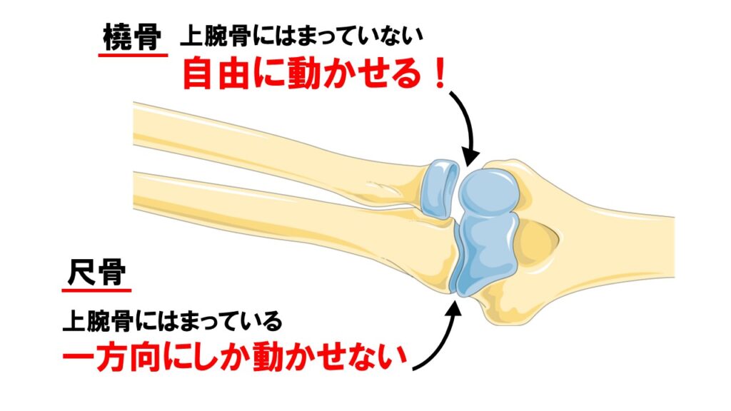 一方で橈骨は、先端が平らな形をしており、比較的自由に動くことができます。
