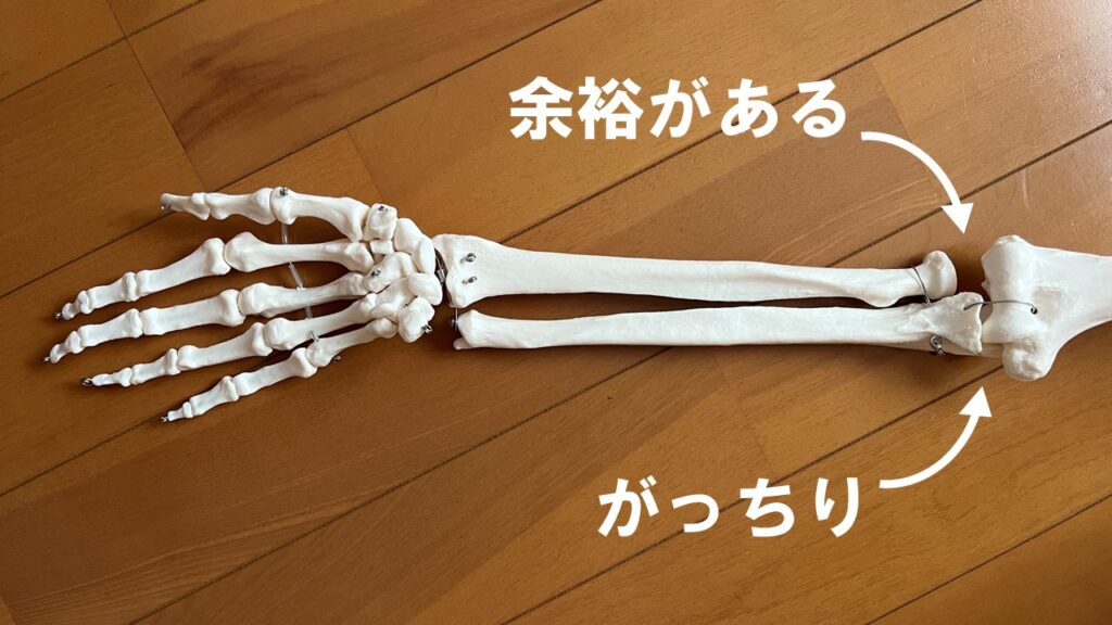 やはり、小指側の尺骨は上腕の骨にしっかりくっつき、親指側の橈骨は余裕がありますね。
